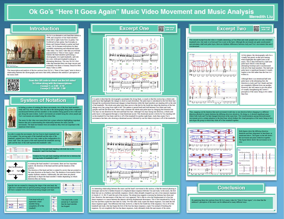 For her research project “Ok Go’s ‘Here It Goes Again’ Music Video Movement and Music Analysis, Liu “aims to show a relationship between the choreography and music that subtly influences the audience’s perception of the music itself,” as she says in her poster introduction.