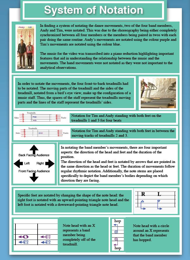 Liu then notated the four treadmills used by each band member in the video, the tracks and sides of which, she points out, make up the same configuration as a music staff when viewed from above.