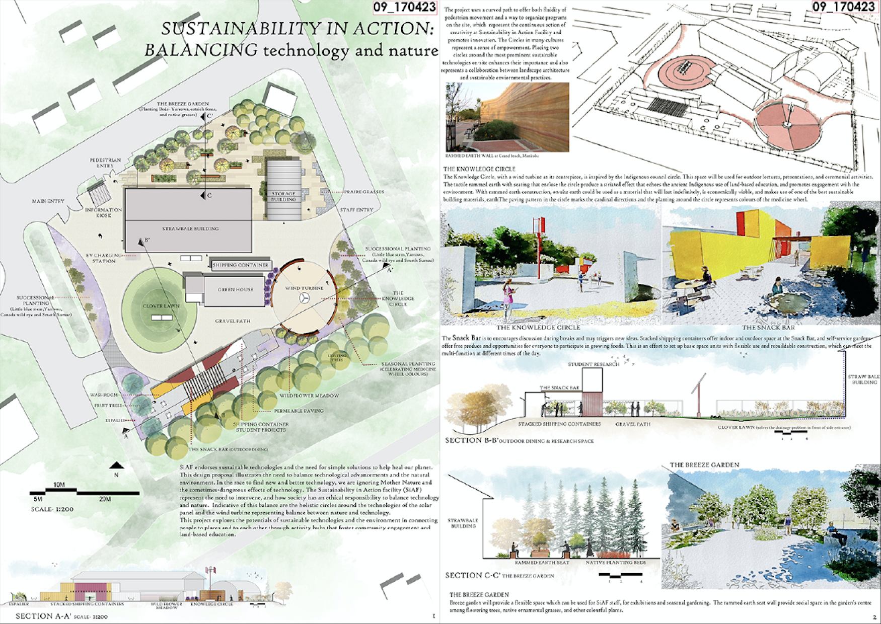 The task was a site design for the external environment enclosed by the chain-link fence at the SiAF site. The functional and spatial program was kept fairly open. The overall intention was to emphasize the area as an open space that “can be used to demonstrate environmental sustainability (through vegetation and/or other materials) and social sustainability (i.e., Indigenous culture) while allowing flexibility for future ideas and projects. Existing renewable energy technologies (i.e., wind turbine, photovoltaic panels, etc.) must remain accessible by foot and should be featured as ‘places of interest’ within the site. Essentially, the Department of Biosystems Engineering covets an outdoor classroom (attractive gathering place), or learning environment, dedicated completely to sustainability. The terrain was left marvellously open for the designers’ imagination with only a few requirements:
