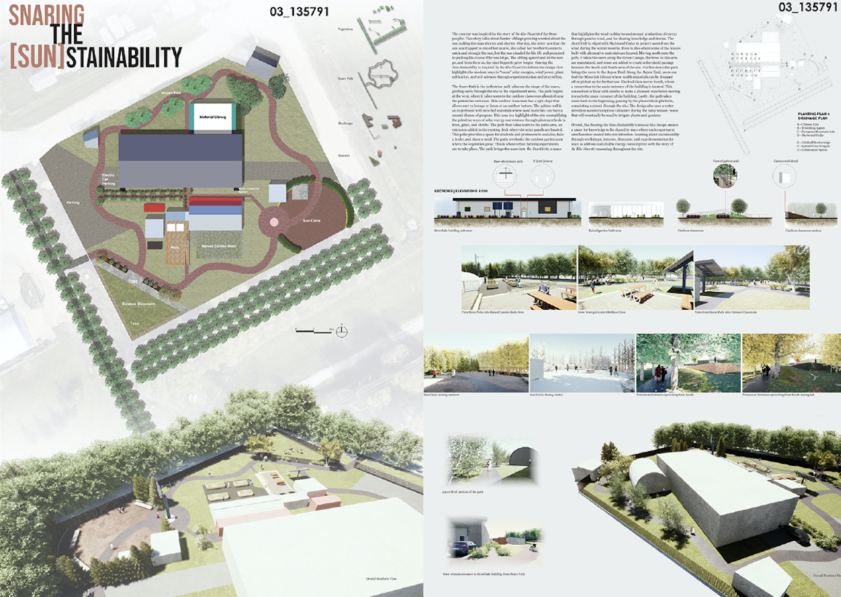 The second prize went to Cindy Tran and Heber Garcia for their design Snaring the (Sun)Stainability. A snare path leads visitors through the site, connecting parking, an outdoor classroom, a patio area, a Sun Circle, the Green Garage and the new Materials Library. The reduced range of features around the straw bales building leaves room for events, programs and/or temporary exhibitions.