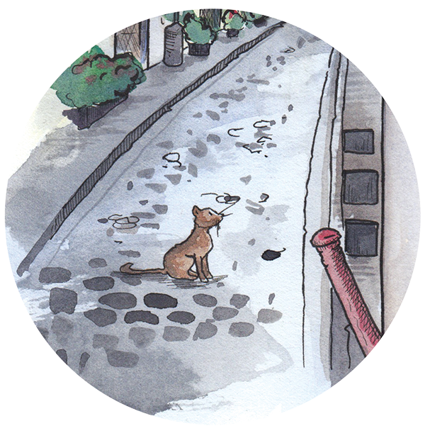 Everything starts with a messy pencil sketch. Sometimes it’s so scribbly that it’s only legible to me. Then I work it up and add details. Once I’m happy, I’ll trace it onto thick, hot-press watercolour paper with my lightbox. I add ink lines with a selection of fine-liners and Japanese brush pens. Then I paint with watercolour.