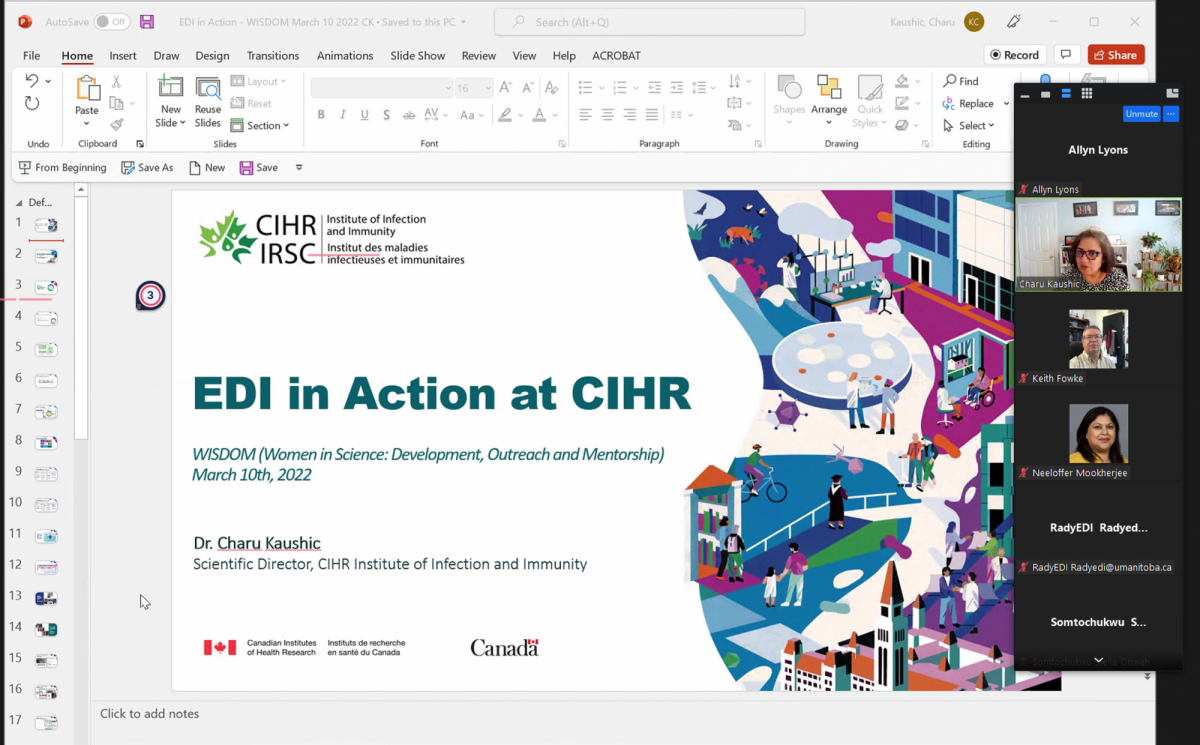 Her talk was part of a monthly seminar series on EDI topics presented by Women in Science: Development, Outreach and Mentoring (WISDOM), a Manitoba organization supported by the UM Rady Faculty of Health Sciences. The group aims to address the underrepresentation of women in science.