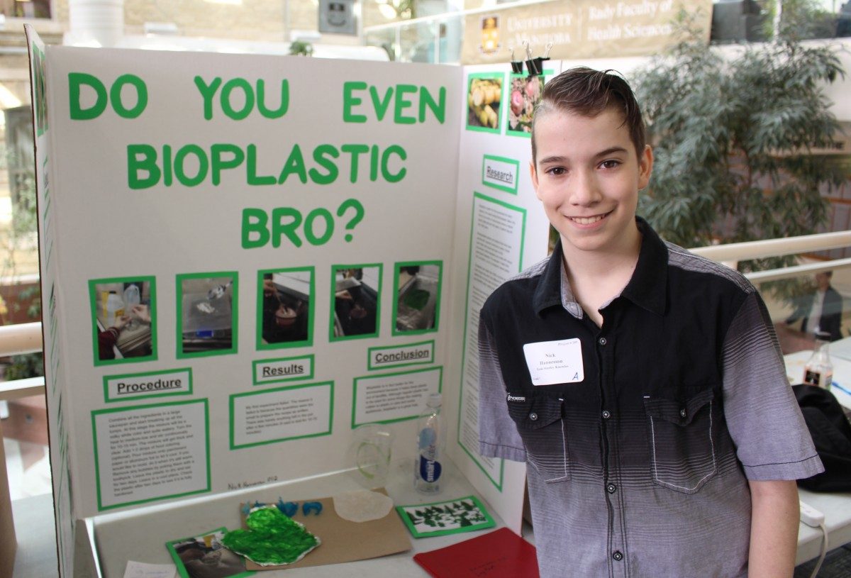 Nick Hannesson proudly showed off his project entitled Do You Even Bioplastic Bro? The Grade 7 student at École Stanley Knowles School looked at how bioplastic is better for the environment than regular plastic.