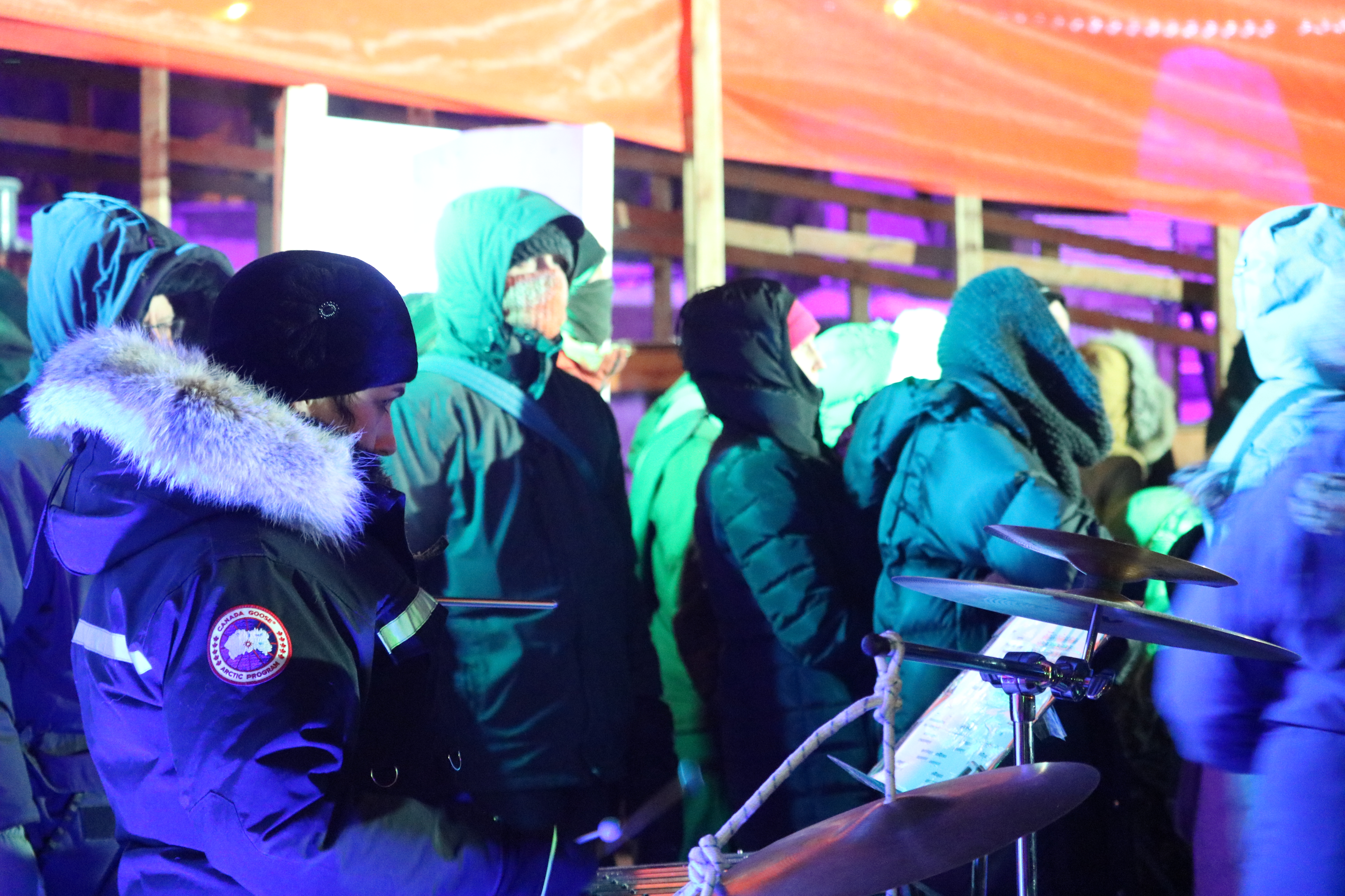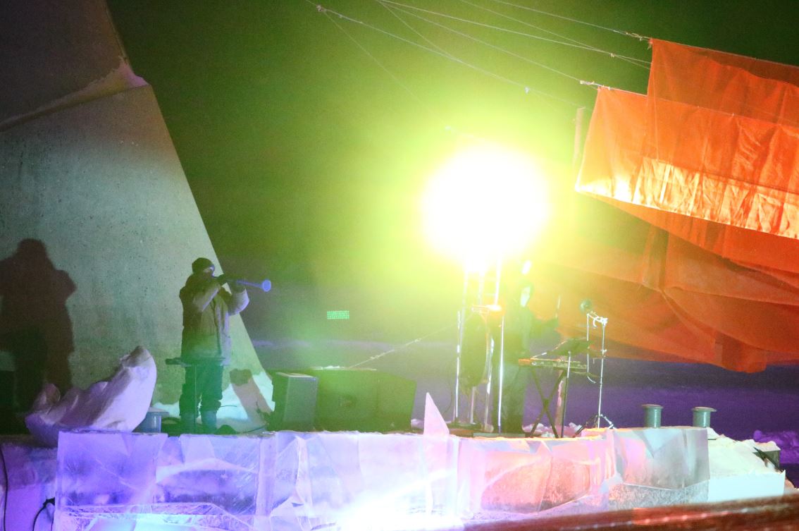 Braving the -30 Celsius temperatures, the audience bundled up in parkas and sleeping bags to watch the performance , which turned out to be one of the coldest nights of the winter. The onlookers created a haze of frozen breath hanging over the pavilion as they sat on benches carved of ice and wood.