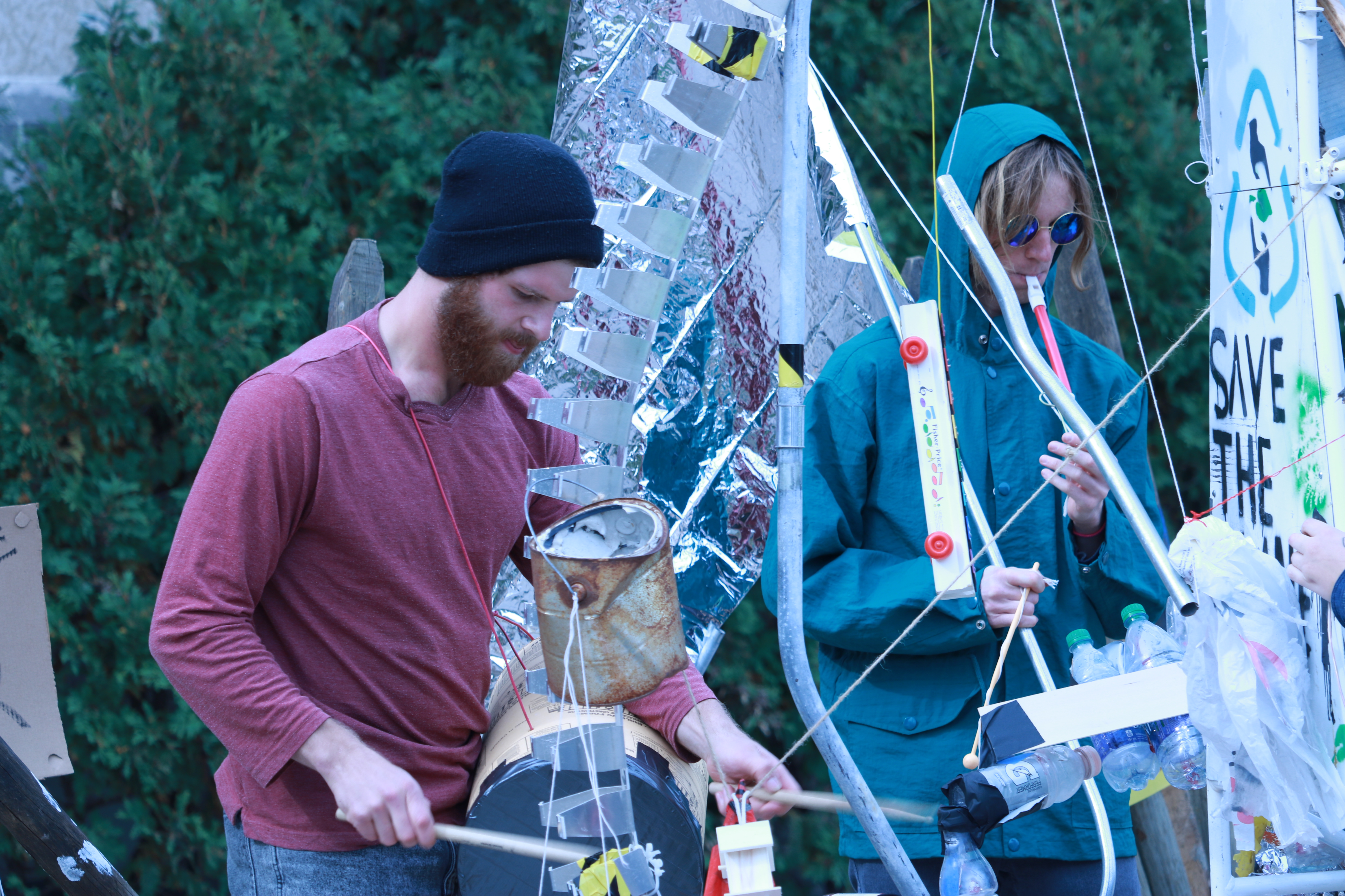 With XIE, Hildebrand participated in the University of Manitoba Climate Strike, where the ensemble performed as part of a collaboration with the UM School of Art. Art students built a sculpture made of discarded items, and XIE then used various tools and vibration sensors to create an improvised performance on campus by interacting with the sculpture. At the end of the performance, the sensors were left attached to the sculpture while the XIE performers walked away. The sensors picked up the residual vibrations and sounds being emitted from the sculpture, which, for this listener, served as a powerful metaphor illustrating that the impact we have on our environments, and the pollution we create continues on long after we leave it behind.