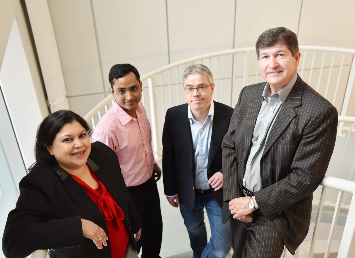 From L to R: Neeloffer Mookherjee, (department of internal medicine & immunology), Goutam Guchhait, (department of chemistry), Frank Schweizer, (department of chemistry and medical microbiology), and George Zhanel, (department of medical microbiology)