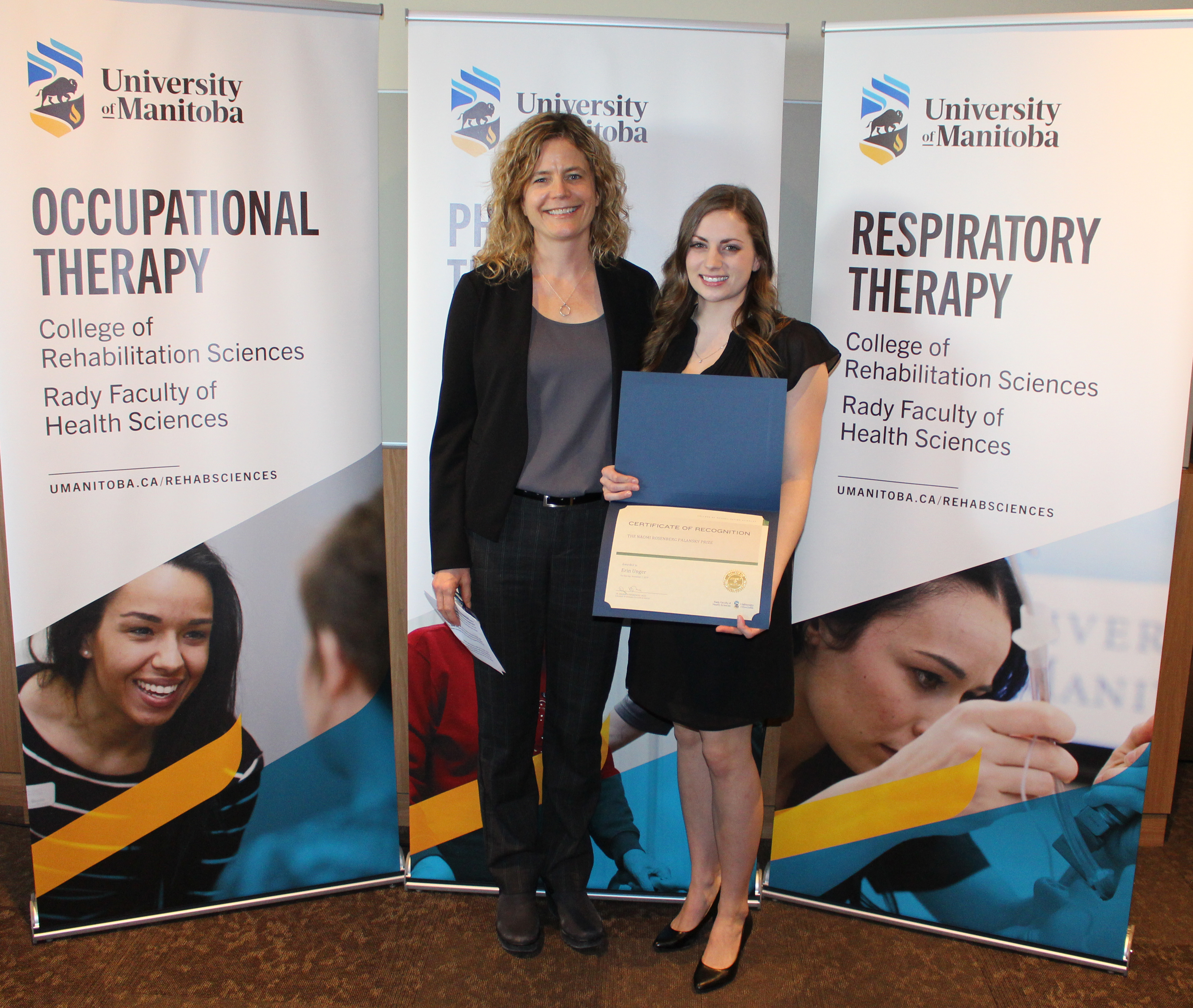 Prior to the convocation ceremony, 22 awards were presented to 18 Rehabilitation Sciences graduands at a luncheon at Canad Inns Health Sciences Centre. Multiple award winners included Andreea Alexandrescu (MOT), Erin Unger (MOT), Matthew Short (MPT), Katie Dalmaijer (MPT) and Gold Medal winner Hanna Kilas (BRT).