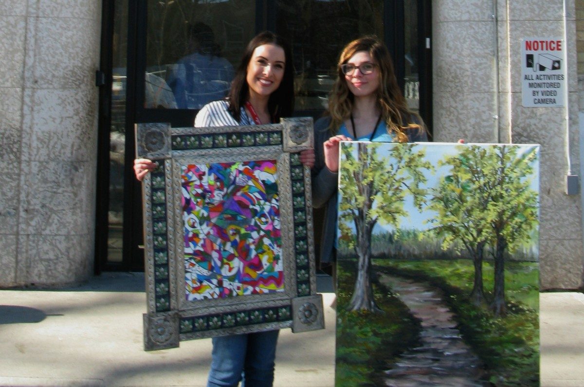Lindsay Koehn and Samantha Repa getting ready for the Community Art Show at the Madison.