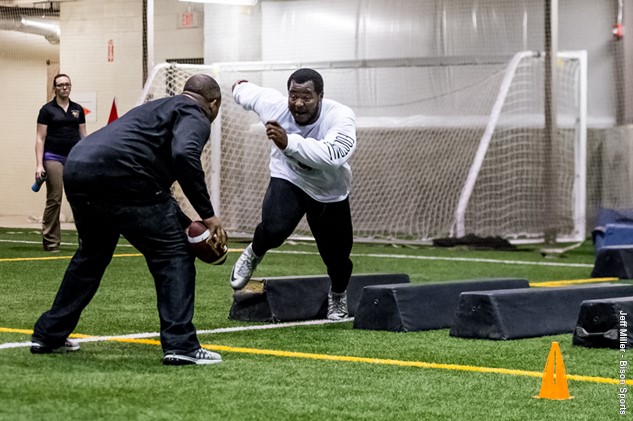 Onyemata’s day started by preparing for the weight room workout at the Manitoba Bisons football facility. He was later tested for over an hour with numerous drills including broad jump, 40-yard dash, Pro Agility, 3-Cone and defensive lineman specific drills.
