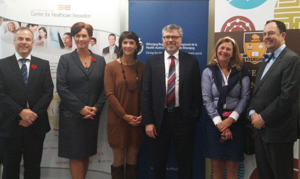 L-R: Mr. Réal Cloutier (VP & COO, WRHA), Hon. Theresa Oswald (MLA Seine River), Dr. Lauren Yee (daughter of George & Fay Yee), Dr. Terry Klassen (Academic Director, CHI), Dr. Robyn Tamblyn (CIHR), Dr. Peter Nickerson (Vice-Dean Research, FHS).