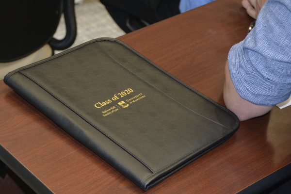 At the annual Welcome Ceremony September 5, The Honourable Mr. Justice Richard Chartier, Chief Justice of Manitoba, presented all first year law students with personalized copies of the Manitoba Law Society’s Code of Professional Conduct. Melissa Beaumont, President, and Stacy Nagle, Executive Director of the Manitoba Bar Association and Kristin Dangerfield, C.E.O. of the Manitoba Law Society attended this Robson Hall tradition.
