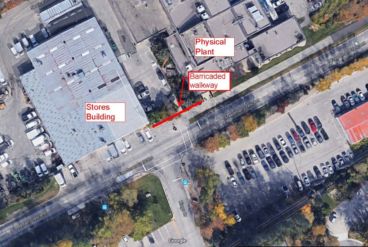 The pedestrian pathway leading from Freedman Crescent to Physical Plant will be closed all day on Saturday, October 28.