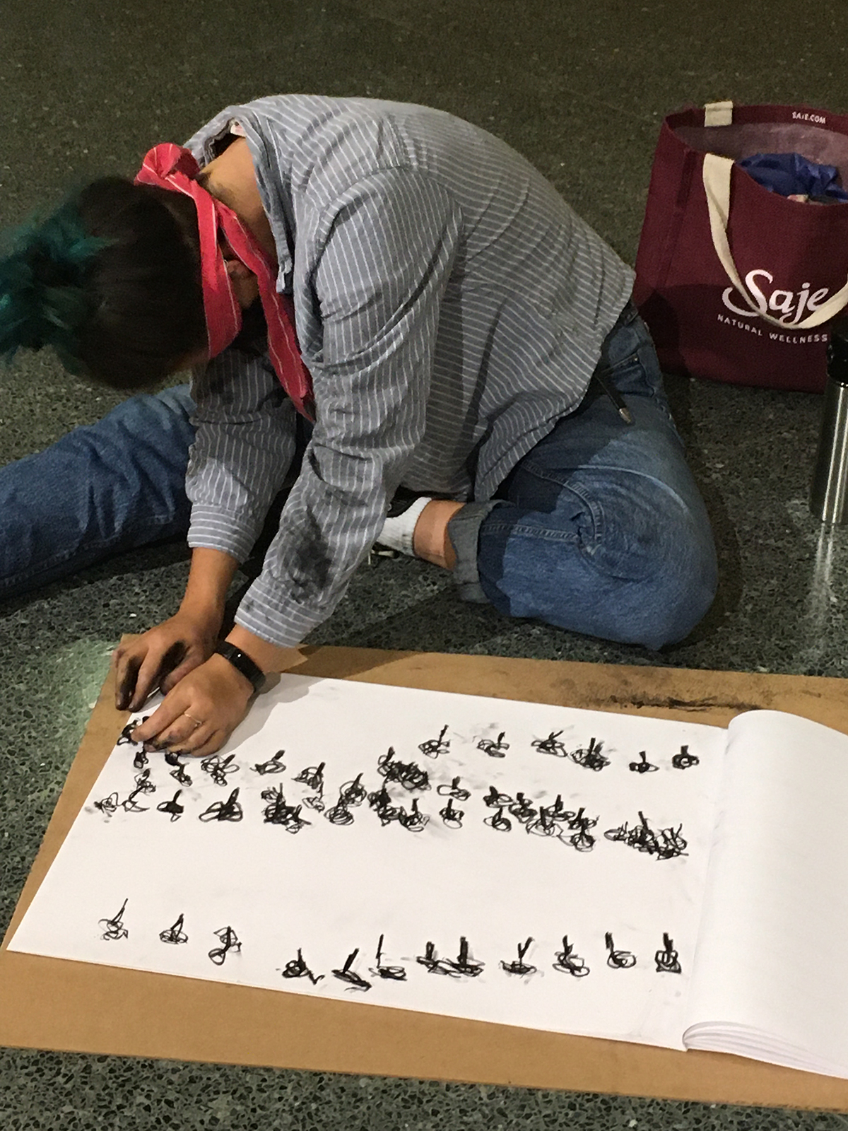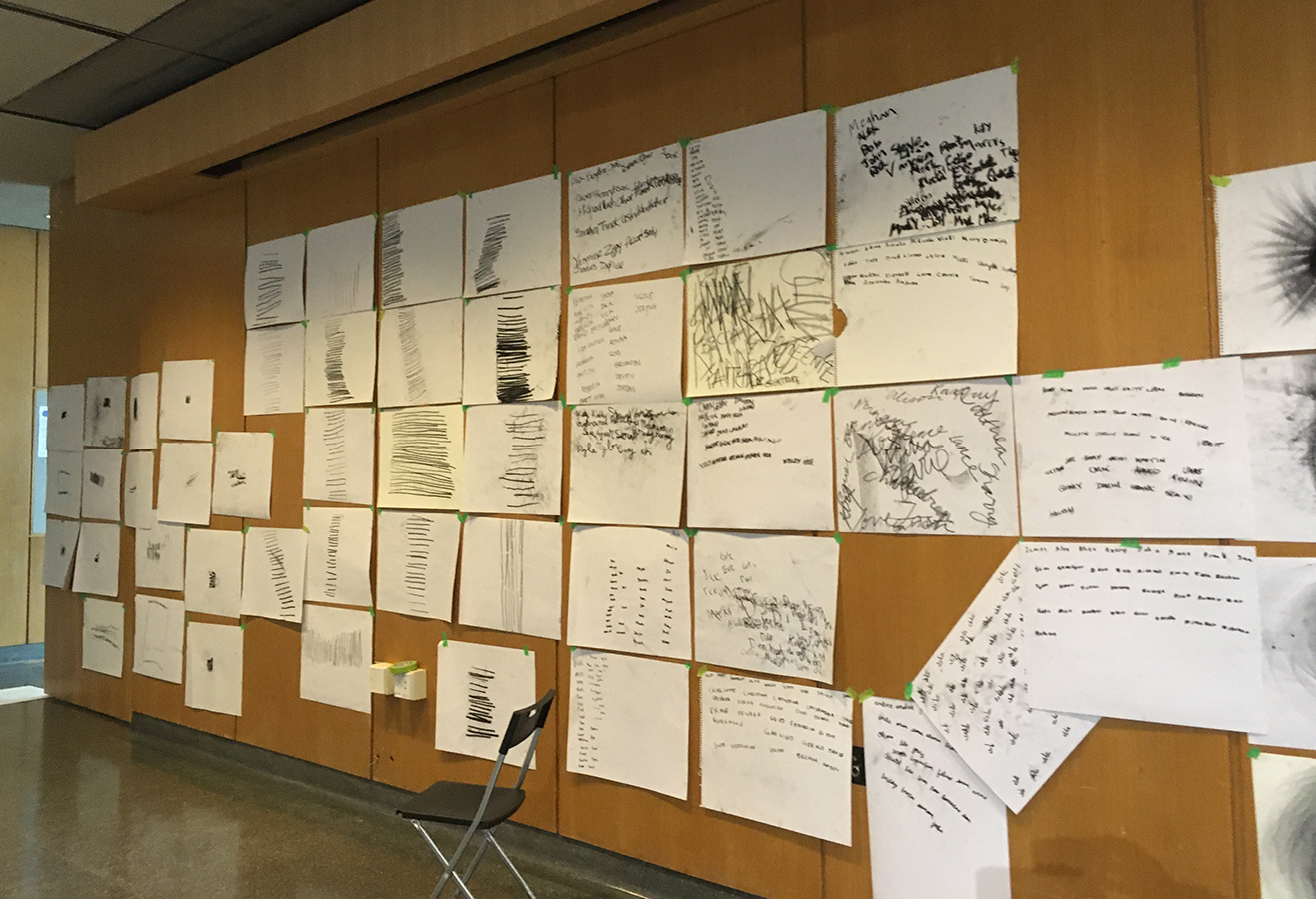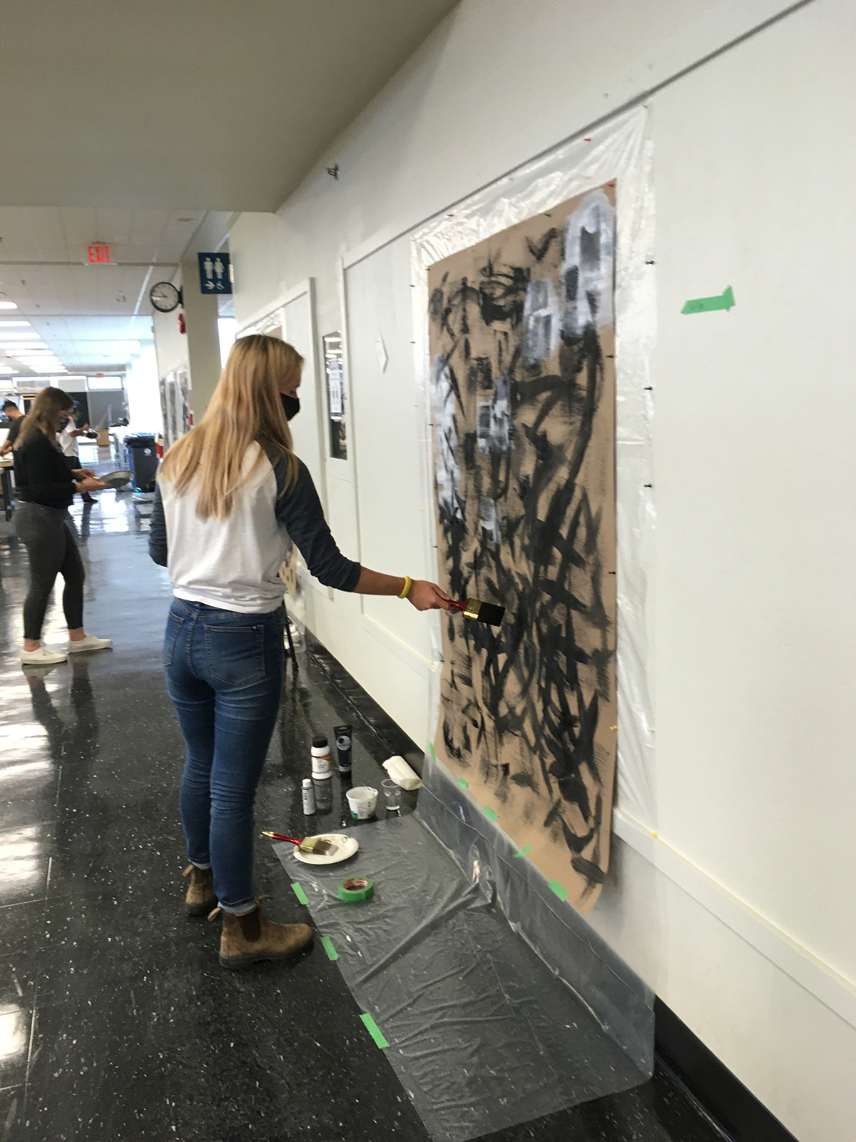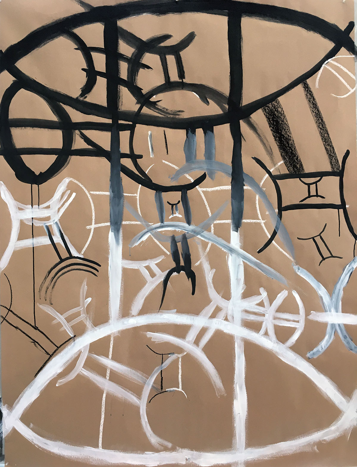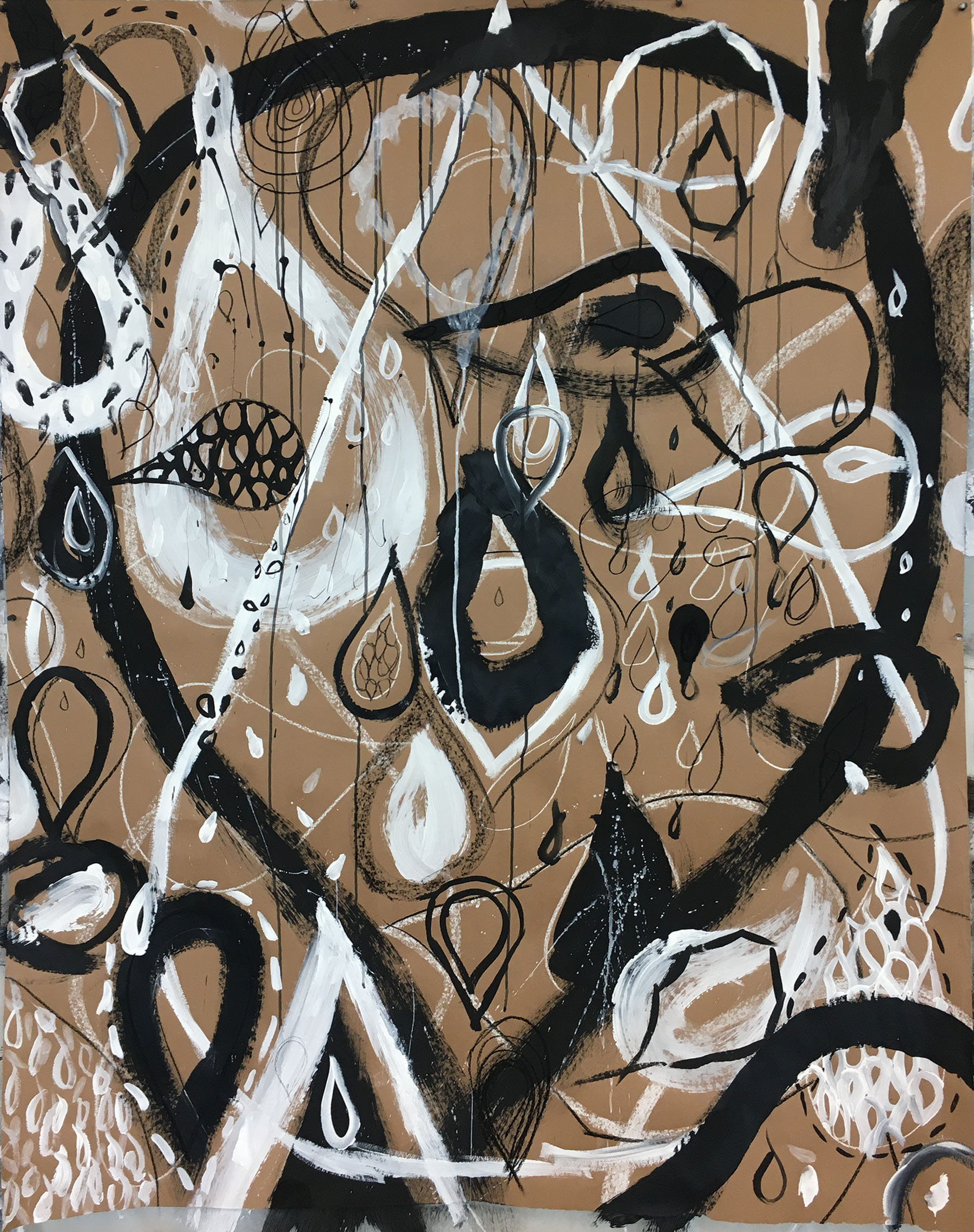 One of the workshop exercises involved students working on 4 x 5’ sheets of brown kraft paper against the wall. Standing firmly in their body and using a 4” paint brush and black acrylic paint, they were instructed to make non-representational marks over the surface of the paper. The process was intuitive; using gestures, patterns, lines and textures, the drawings were “automatic”, constructed without a plan or purpose and most importantly, without conscious control. After this initial warm up exercise, the second drawing embraced the concept of “erasing” marks with gesso and the use of smaller brushes. Employing charcoal, chalk, acrylic and gesso, the last drawing incorporated the repetition of a motif selected by each student.