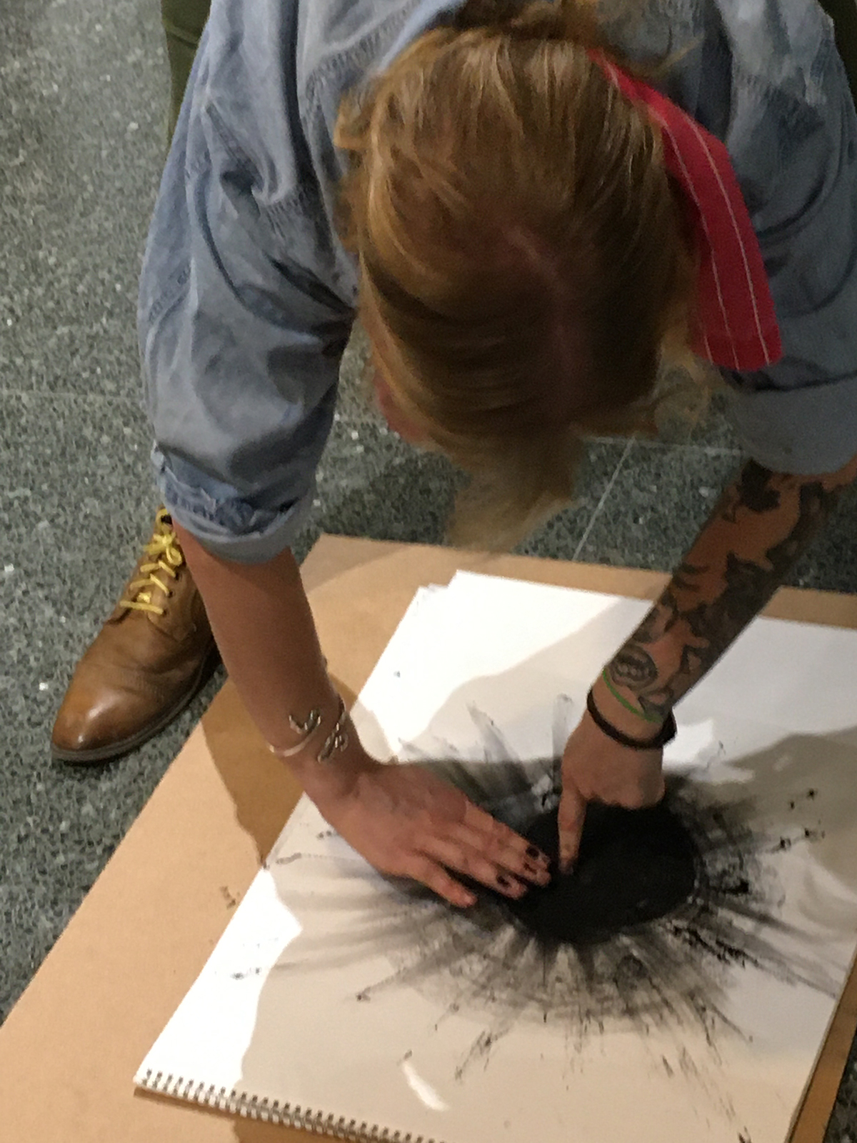 Close your eyes and find the centre of the paper. Taking the piece of charcoal in your left hand, create the darkest centre you can, extending out to the sides in lighter gradations to leave the edges white. You have 10 minutes. No peeking.