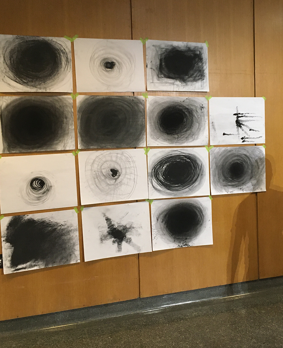 The purpose of drawing on large sheets of paper was to bring students into unfamiliar terrain and to expand the vocabulary of their mark making. By taking risks and embracing chaos, the resulting drawings were fresh and incredibly energetic.