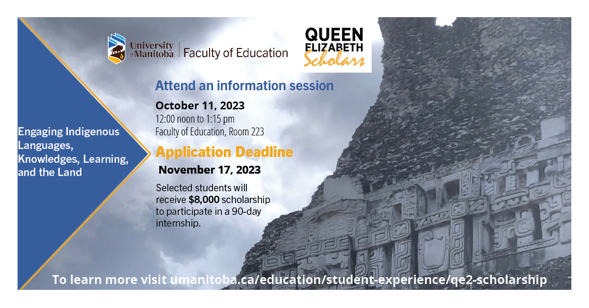 - October 11, 2023 12:00 (noon) – 1:15 pm. Faculty of Education, Room 223. Hybrid Event. Register here https://umanitoba.ca/education/student-experience/qe2-scholarship/register-info-session