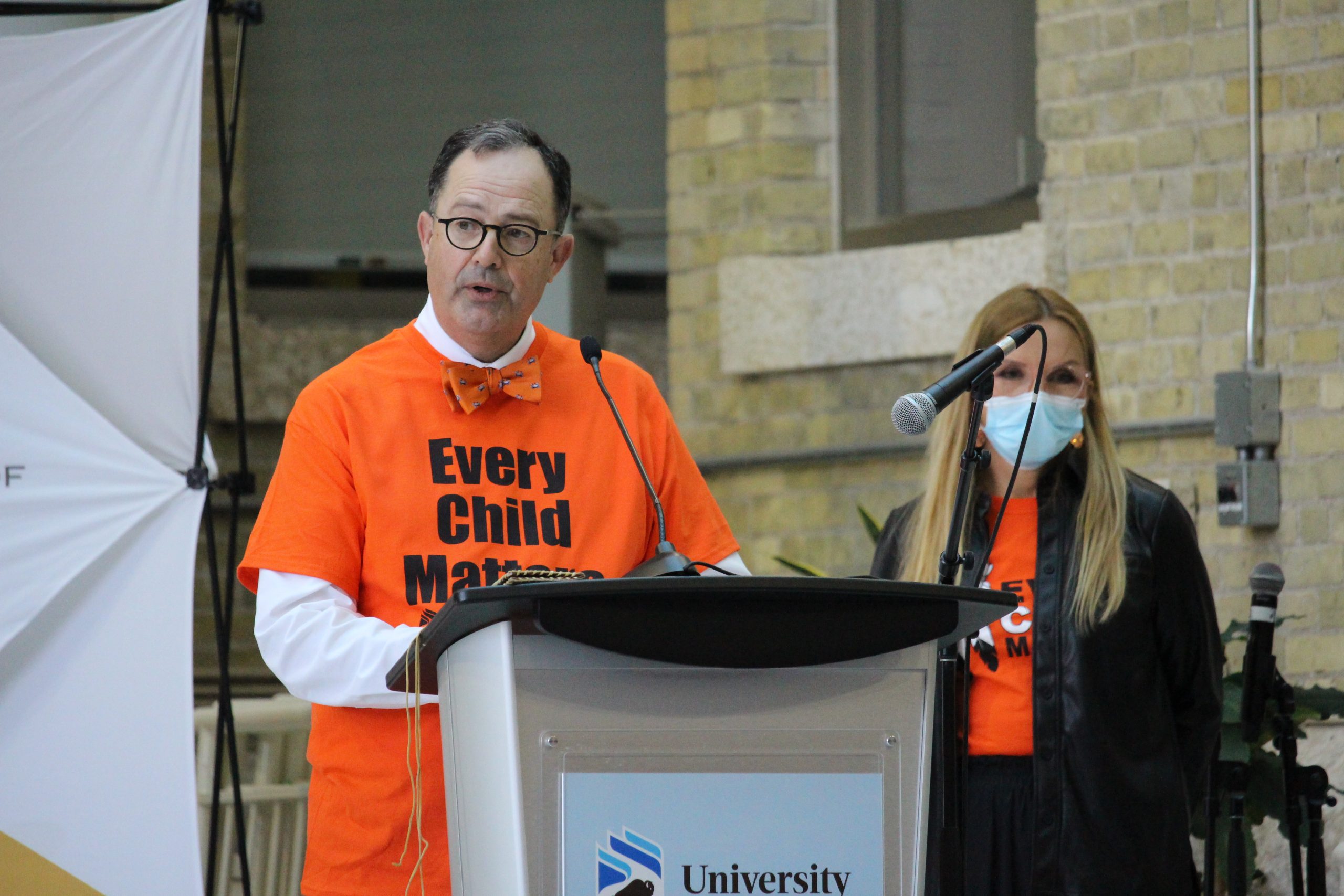 The event began with a ceremony hosted by Deanna Garand, a student in the Mahkwa omushki kiim: Pathway to Indigenous Nursing Education (PINE) program. There was an opening prayer from Brenda Longclaws, Knowledge Keeper for the College of Nursing, and speakers included UM President and Vice-Chancellor Dr. Michael Benarroch, Associate Vice-President (Indigenous) Scholarship, Research and Curriculum Dr. Cary Miller, and third-year nursing student Kristen Pratt, who delivered the story of Phyllis Webstad that inspired Orange Shirt Day.