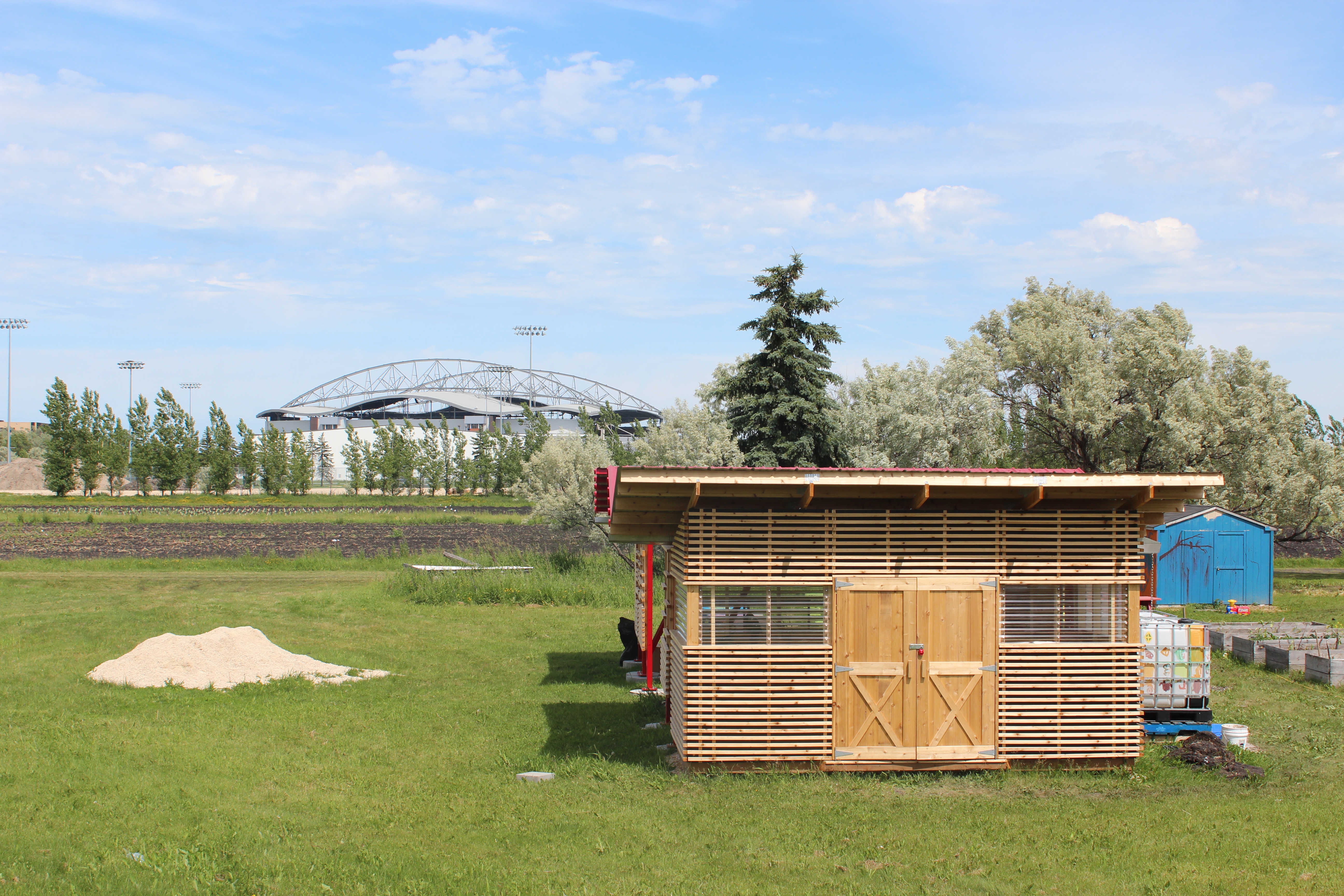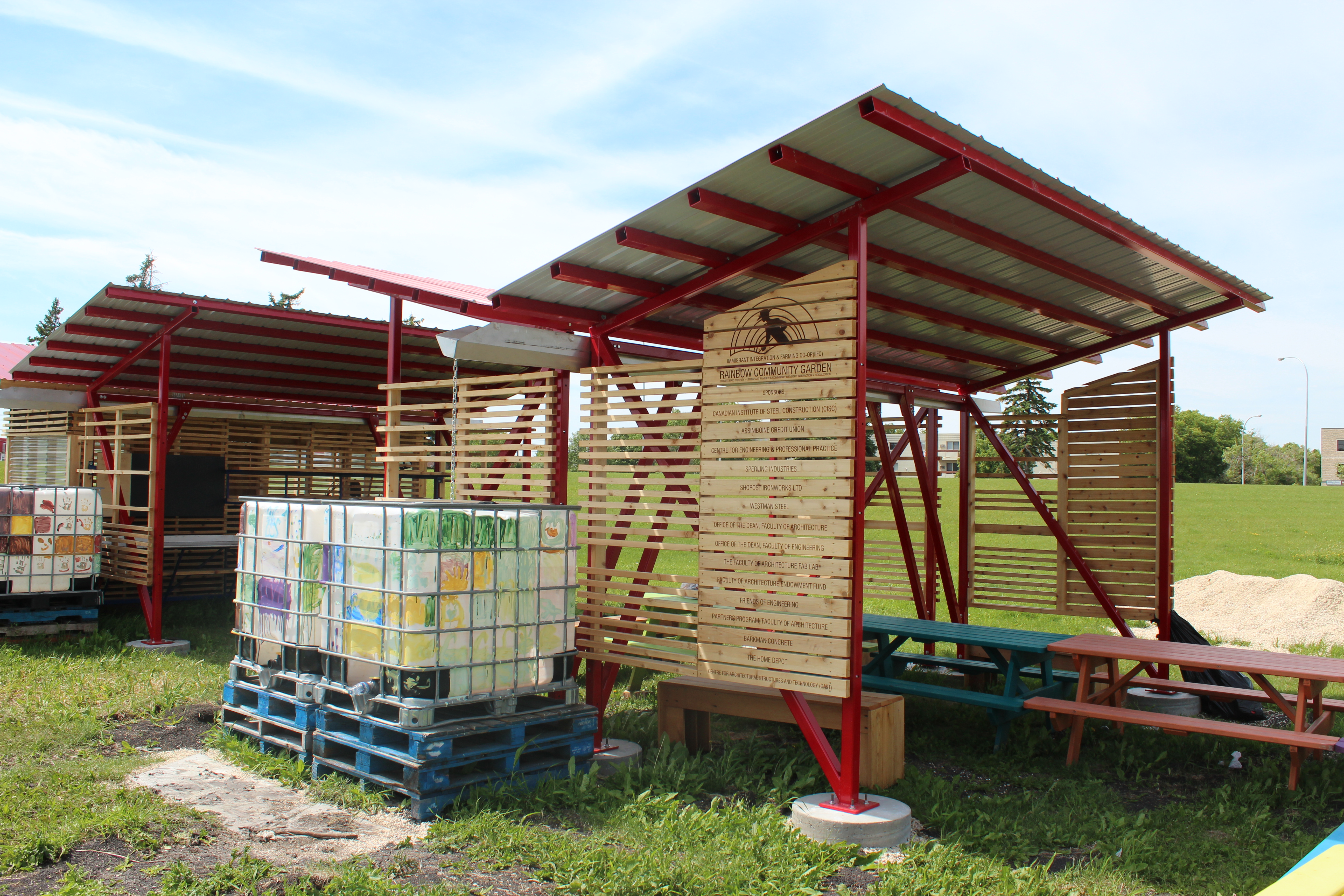 The project is the result of a year-long partnership of these two faculties at the University of Manitoba, working with the Immigrant Integration and Farming Community Co-op (IIFCC, a.k.a. The Rainbow Gardens community) to design and build several urgently needed structures.