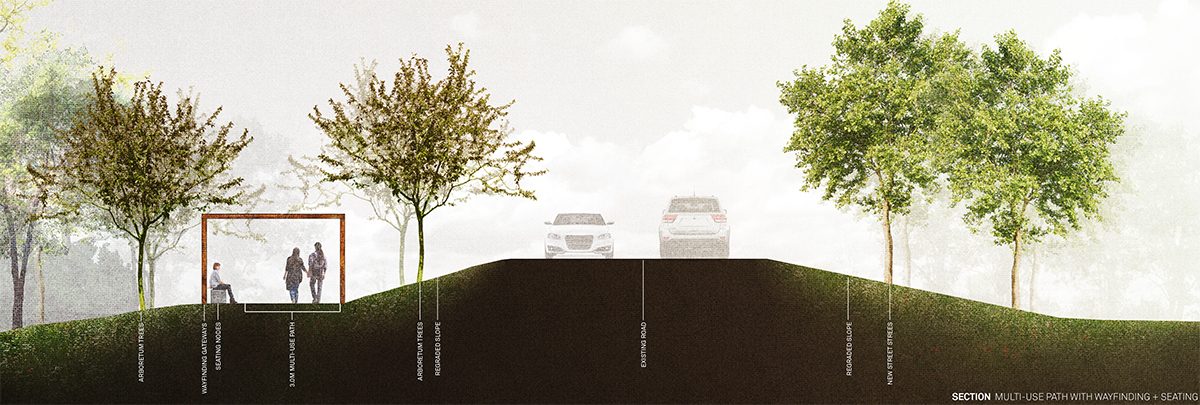 The enhancement of the eastern transportation corridor will create a new “working landscape” as part of the long-term plan for the campus. This gateway to the riverbottom forest and future learning landscape of the Point Lands will transform over time, providing education and engagement for numerous faculties as well as a new recreation destination for pedestrians and cyclists alike.