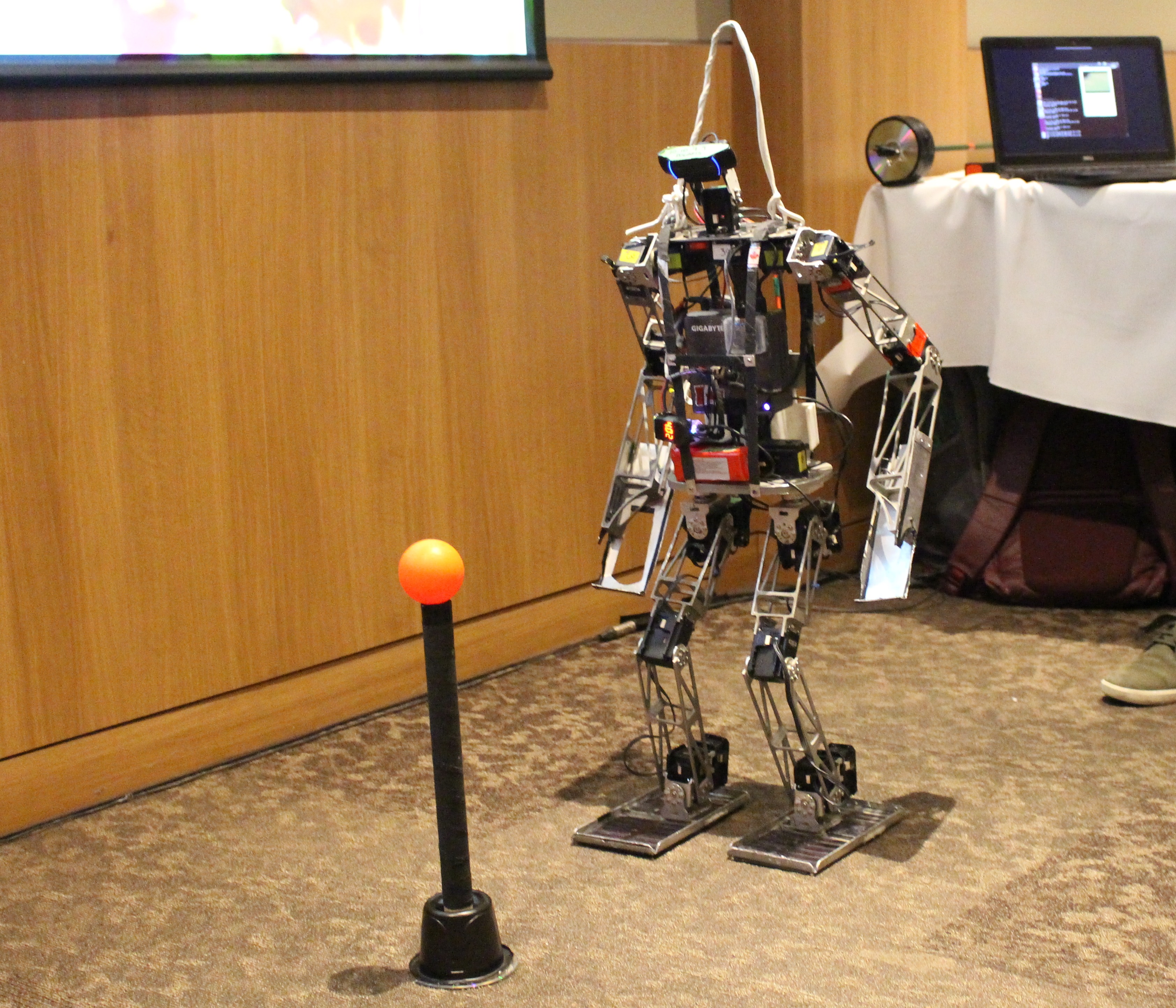 Dr. Meng Cheng Lau, a post-doctoral fellow at the U of M computer science department’s Autonomous Agent Laboratory, presented live and recorded basketball, weightlifting and archery demonstrations by Polaris, a 93 cm, 6.7 kg robot.
