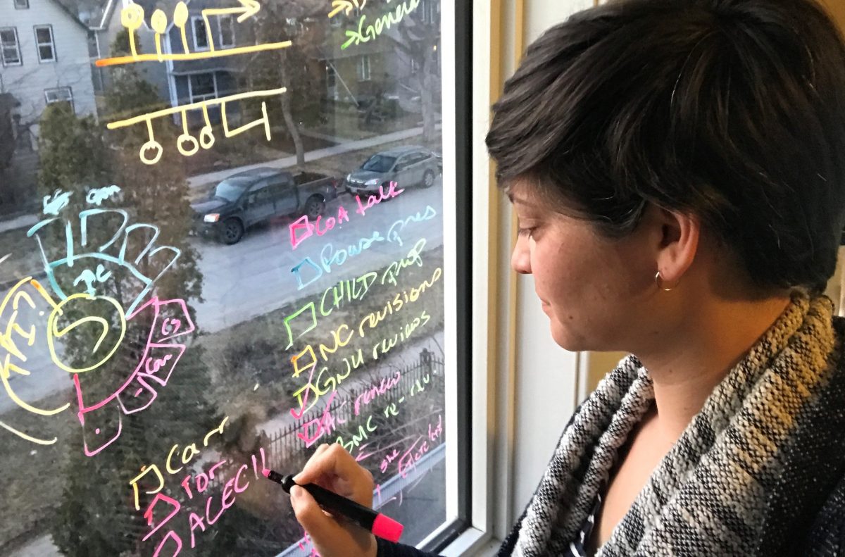 Dr. Meaghan Jones, assistant professor in the Max Rady College of Medicine, uses a window in her home office as a whiteboard.
