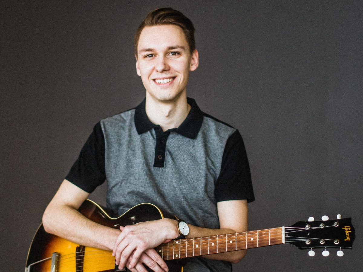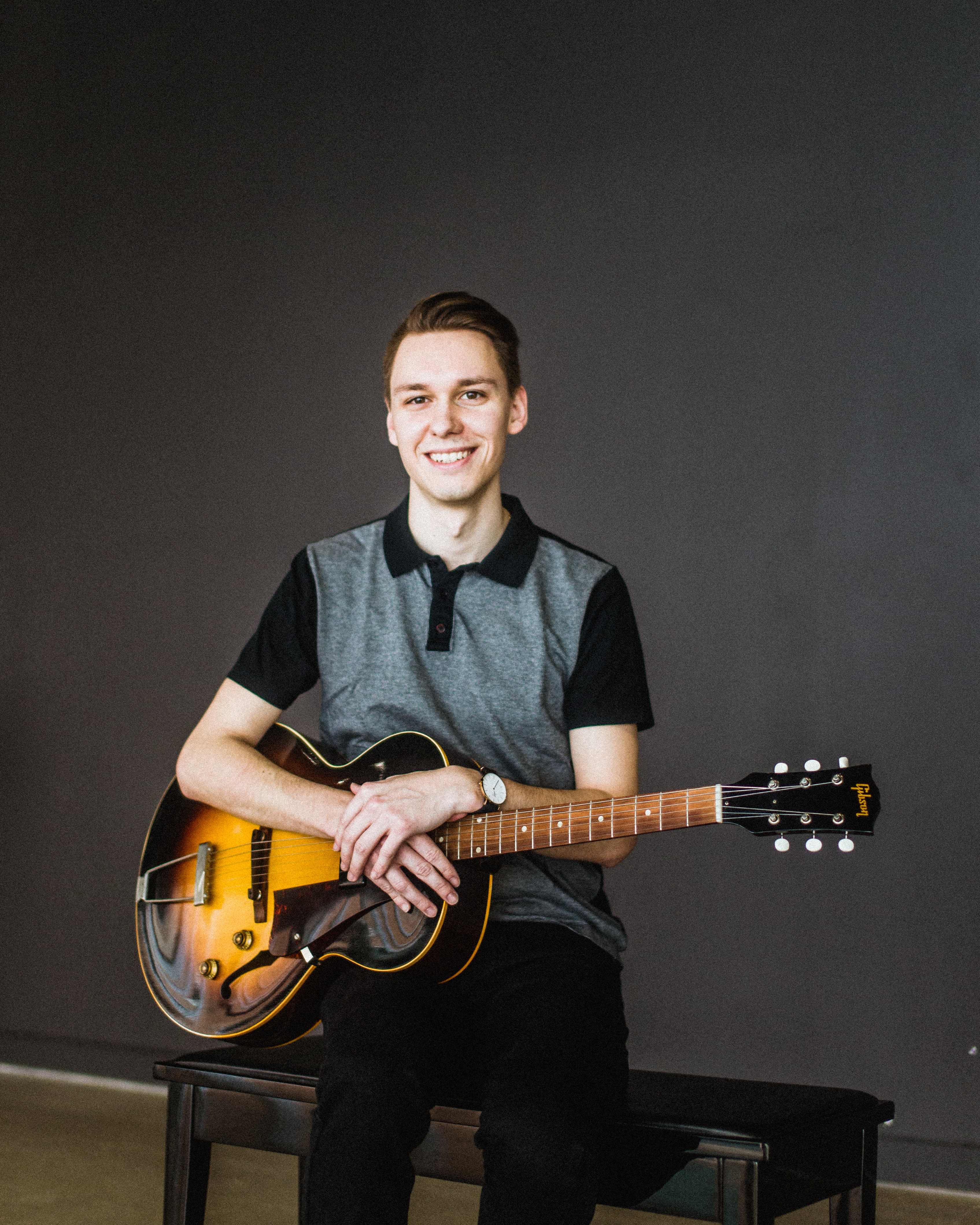 2020 Desautels graduate Rylan Knaggs (Bachelor of Jazz Studies, Guitar) is known for his fierce improvisational jazz skills and beautiful guitar solos. Originally from Alonsa, Manitoba, Knaggs grew up watching his relative Arnold Asham lead the Asham Stompers at an annual festival dedicated to celebrating Métis performing arts, and those performances inspired him to pick up the guitar.