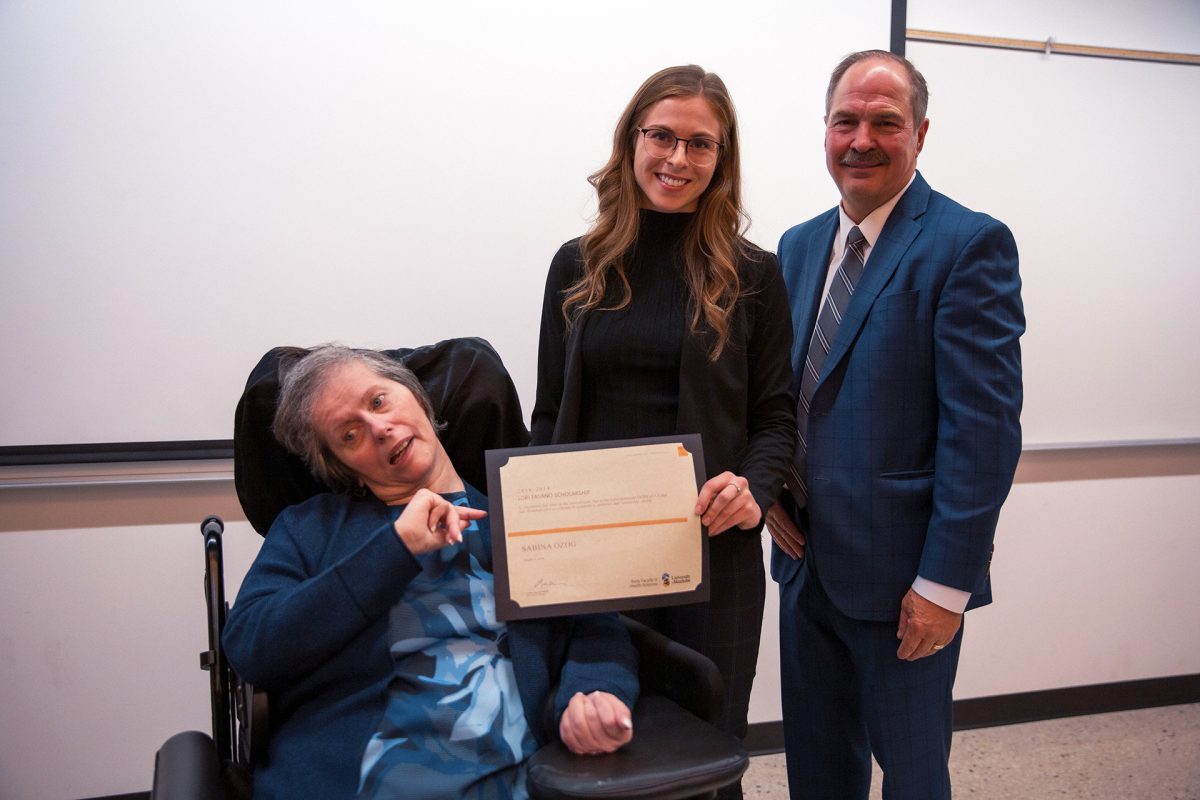 The first recipient of the scholarship was Sabina Ozog. Lori and Dave Fasano and their children, Alison and Scott, travelled from Mississauga to Winnipeg to present the award in person at the ceremony held on Oct. 4 at the College of Pharmacy.