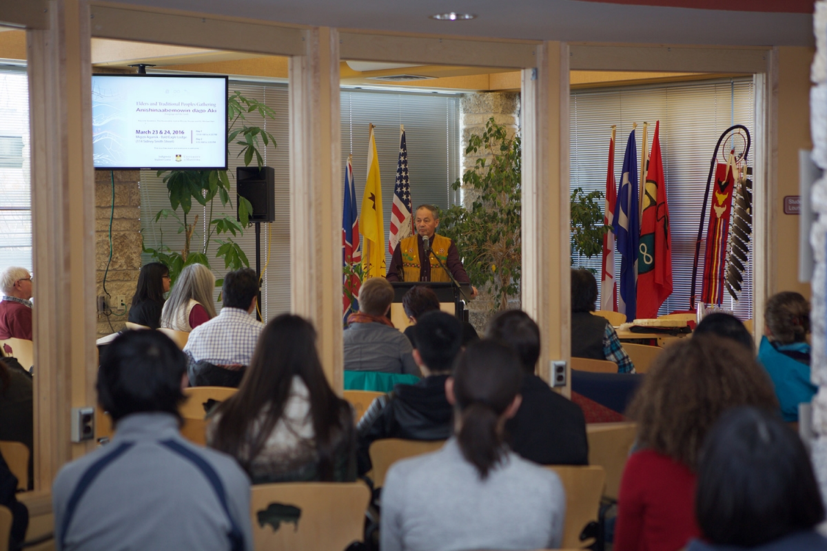 Elder-in-residence Norman Meade speaks at the gathering on March 24, 2016. // Photo by Dan Gwozdz