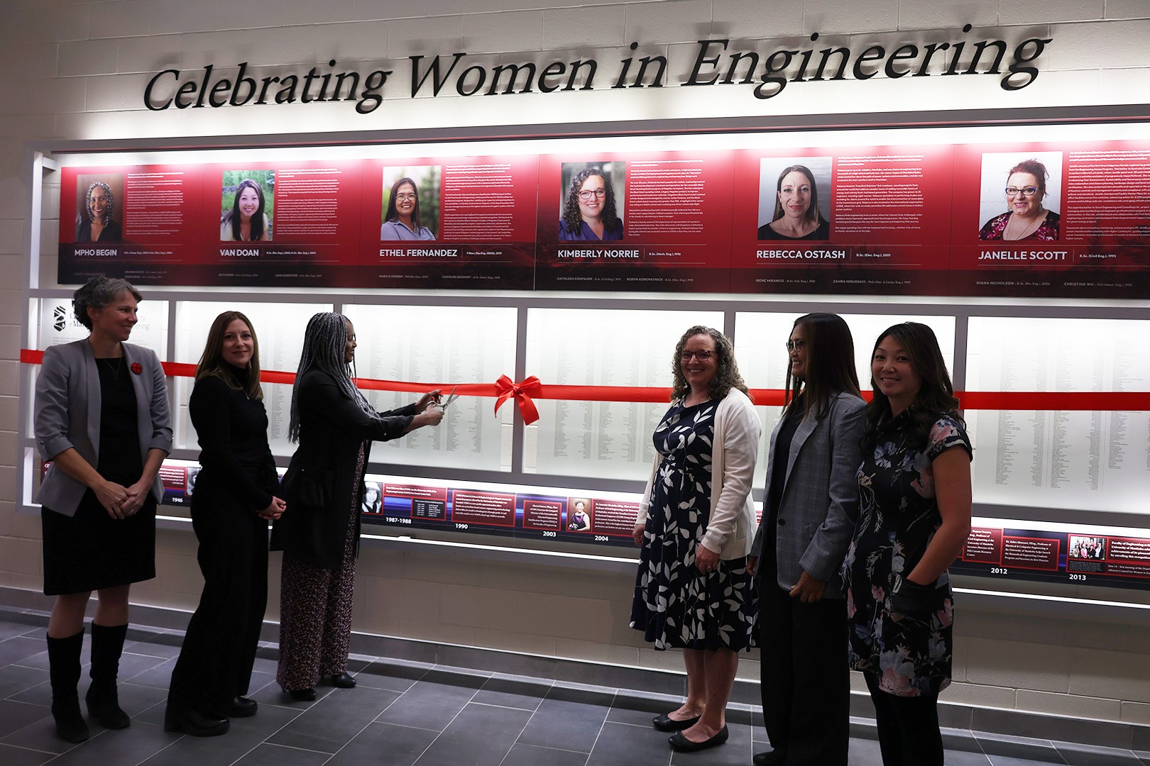 In 2013, the Price Faculty of Engineering unveiled a permanent installation, Celebrating Women in Engineering. Ten years later and thousands of female-identifying graduates later, we are thrilled to unveil a new set of six women who continue to excel in their field and contribute to the engineering community in so many ways. All six women were able to join us (one virtually from Alberta), to mark the occasion. Continue reading to discover more about these phenomenal women who truly deserve to be celebrated. The installation can be viewed in person in the Atrium of the Engineering and Information Technology Complex at the University of Manitoba.