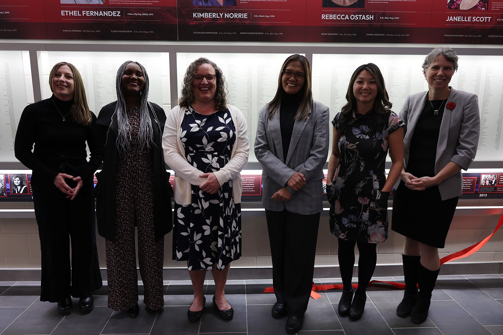 In 2013, the Price Faculty of Engineering unveiled a permanent installation, Celebrating Women in Engineering. Ten years later and thousands of female-identifying graduates later, we are thrilled to unveil a new set of six women who continue to excel in their field and contribute to the engineering community in so many ways. All six women were able to join us (one virtually from Alberta), to mark the occasion. Continue reading to discover more about these phenomenal women who truly deserve to be celebrated. The installation can be viewed in person in the Atrium of the Engineering and Information Technology Complex at the University of Manitoba.