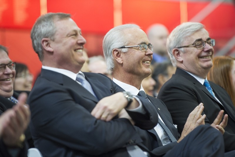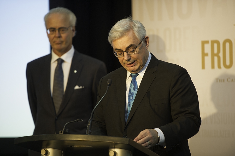 Hartley Richardson, president of the Richardson Foundation (left) speaks at the April 14, 2016 announcement while Paul Soubry, Front and Centre campaign chair, looks on. // Photo by David Lipnowski