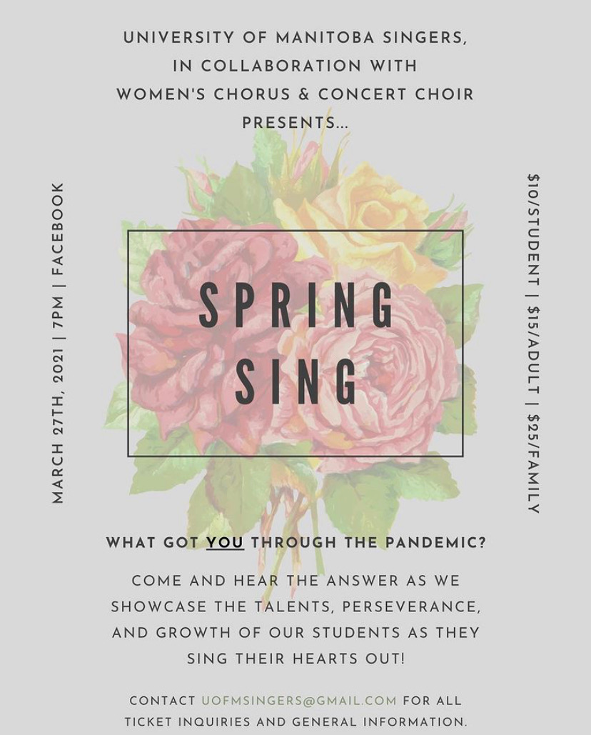 - Tickets: $10 for students/$15 for adults/$25 for families (To purchase tickets, fill out the form at https://docs.google.com/forms/d/1h6temMomFIyyKh-0K48VM_-i9zvmcLKtVYZCX2mWGZY/viewform?edit_requested=true and then submit payment via e-transfer to uofmsingers@gmail.com. A link for the concert will be sent to you the day of the concert.