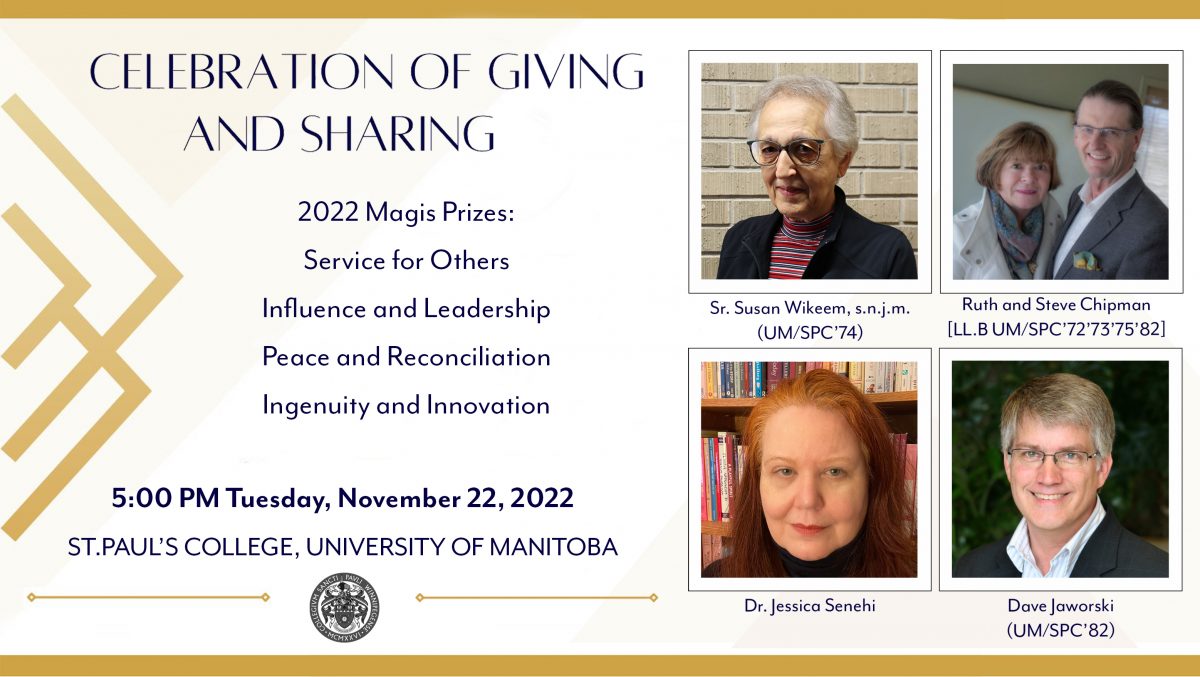 Join us in celebrating these exceptional individuals and showing our appreciation for their great works. The evening ceremony begins at 5:00 p.m. at St. Paul’s College (Christ the King Chapel and Hanley Hall). Please, let us know if you are attending the event by November 14th by RSVP’ing (204) 474-9148 or spcfoundation@umanitoba.ca