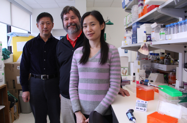 PhD student and researcher Yueqin Zhou (right) in the lab with Geoff Hicks (centre) and Songyan Liu (left), both of the regenerative medicine program — she helped find a gene related to amyotrophic lateral sclerosis (ALS; also known as Lou Gehrig’s Disease) that helps to slow down the progression of the disease.
