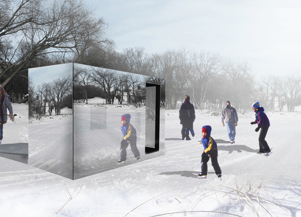 The “Mirror Cloaking” shelter, by U of M students Wong Zheng, Rafael Vieira Leal, Wei Zou, uses one-way mirrors and polished stainless steel panels to create a mirror box that allows skaters to perceive the warming hut from outside as part of the winter landscape — yet closer inspection reveals that the hut is a reflection of its surroundings. And once inside, skaters can see out.
