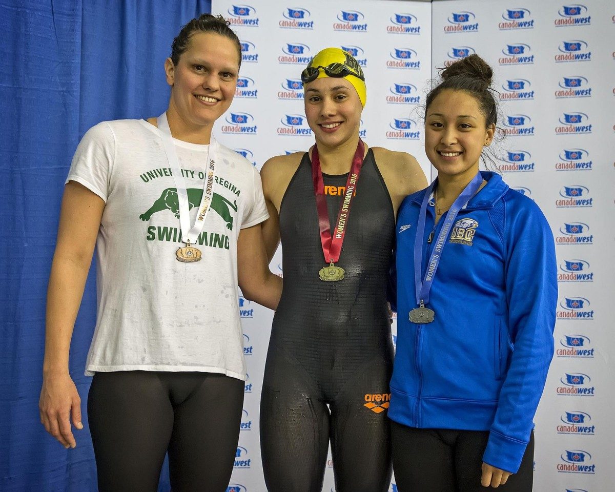 BISON KELSEY WOG (CENTRE) AT THE CANADA WEST SWIM CHAMPIONSHIPS // SUPPLIED PHOTO