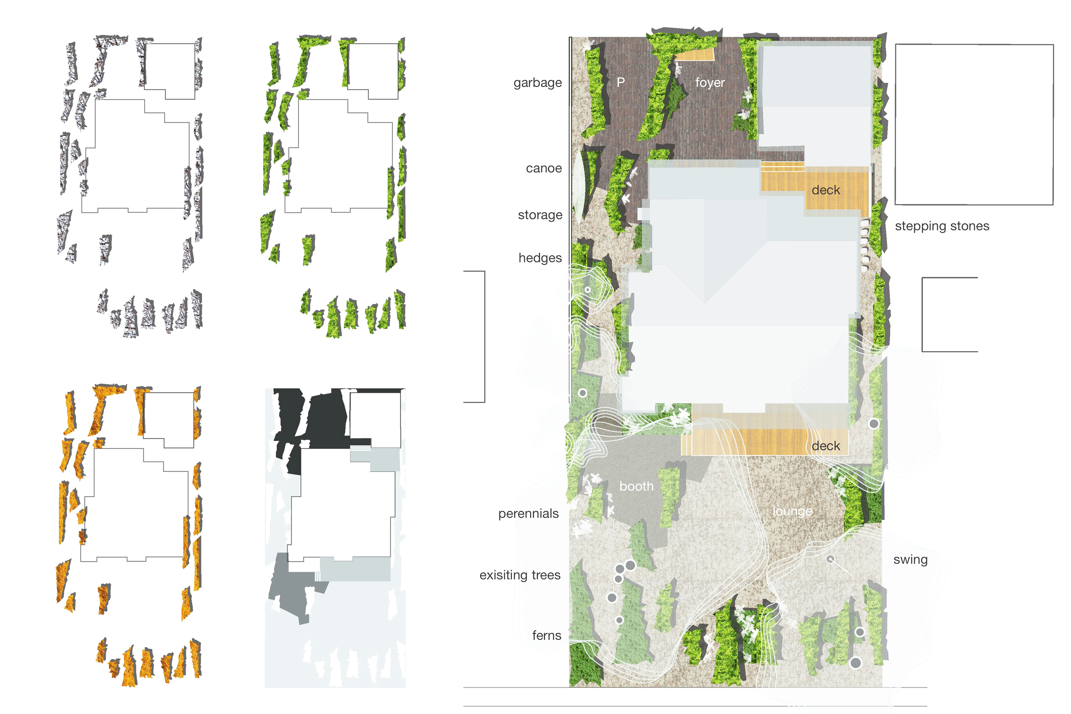 The branches of mature trees on the lot and neighbouring properties had formed an expansive canopy over the area. But a large elm tree infected with Dutch elm disease had to be felled, and this created a clearing bathed in light. Straub Thurmayr used a simple trick to structure the space and allow it to develop its own rhythm. Sumacs love the sunlight. Irregular hedges of smooth sumac were planted along the lines of light. These green figures gather like strange creatures around the house. They define and separate all the functional areas without creating barriers or boundaries. It is a fresh interpretation of the ancient art of topiary.