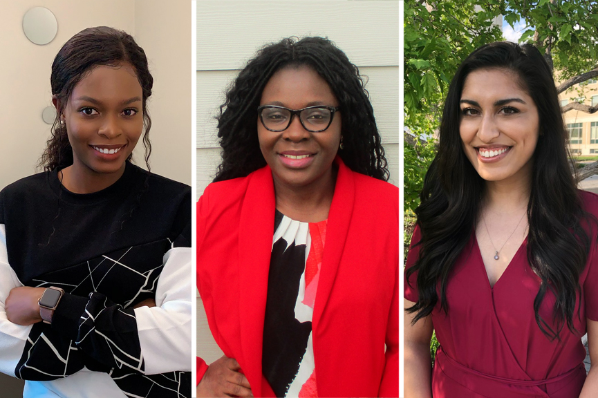 (L to R) Manitoba Centre for Nursing Health Research (MCNHR) summer research assistants Sandra Aboh, Naomi Armah and Sidrah Khawaja.