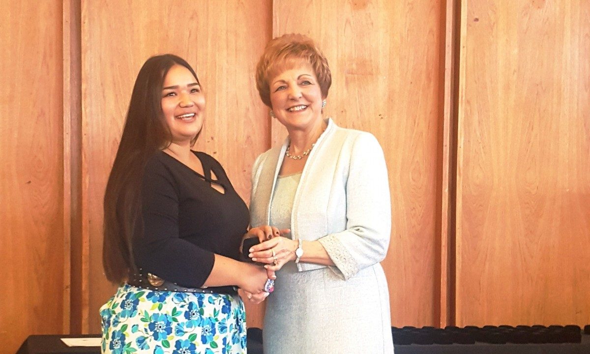 Graduating nurse Shaylee Ducharme receives her pin from Dr. Netha Dyck, Dean, College of Nursing, Rady Faculty of Health Sciences.