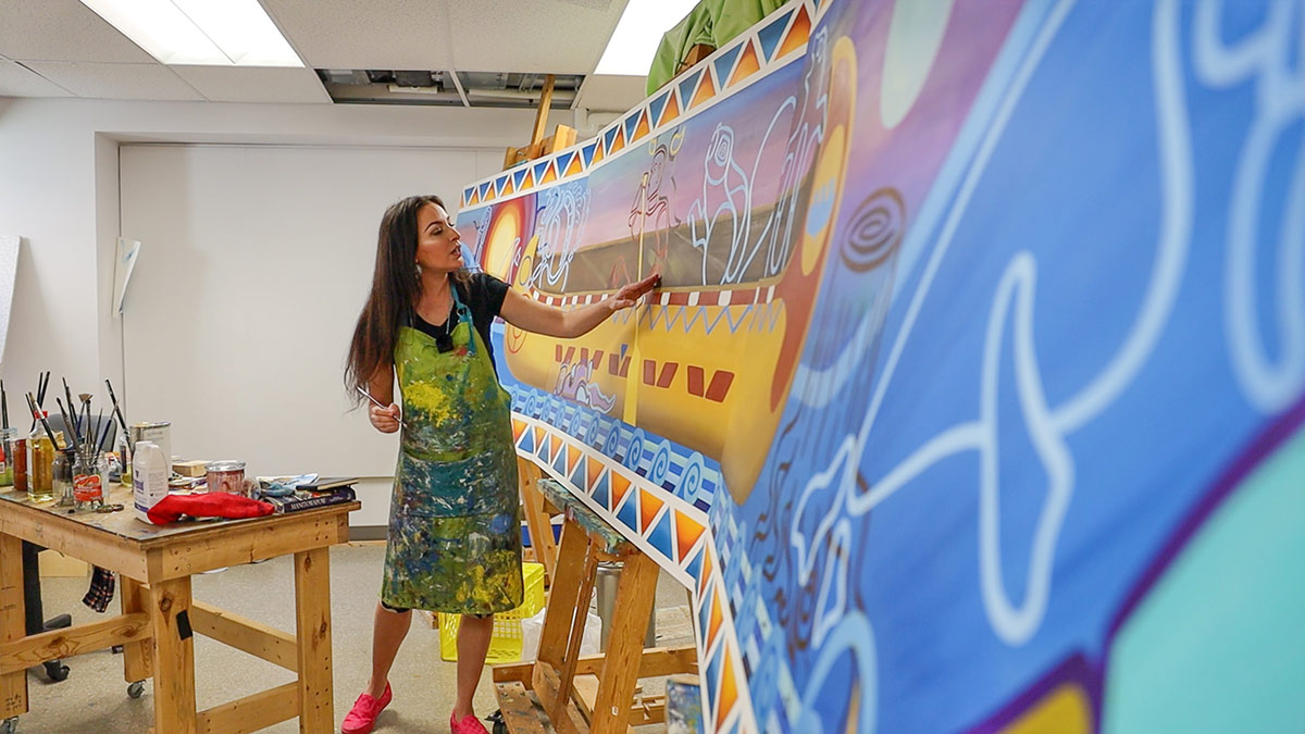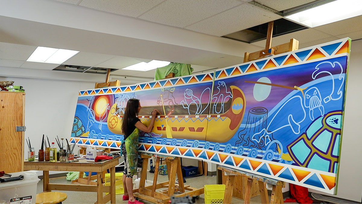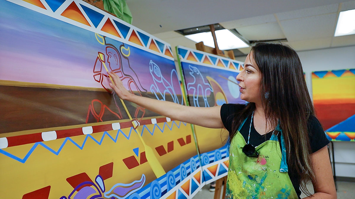 Physical changes in the faculty include a stunning new mural in the Active Living Centre by Anishinaabe-Oyate artist and alum Kristin Flattery—Ozhaawashkwaa Mashkode-Bizhiki (Blue Buffalo Womyn) [BFA(Hons)/17, BEd/20]. Flattery’s vision inspires healthy living for everybody and helps Indigenous students see themselves reflected in the space. “It also shows respect for the land on which our campus is situated,” says Dr. Cheryl Glazebrook, a professor in FKRM who chairs FKRM’s EDI committee.