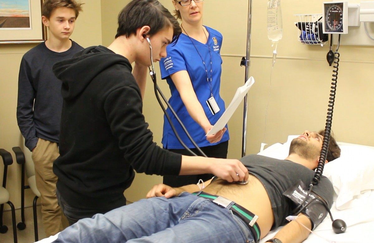 Grade 9 student Joel Fowke examines a standardized patient as part of Take Our Kids to Work Day.