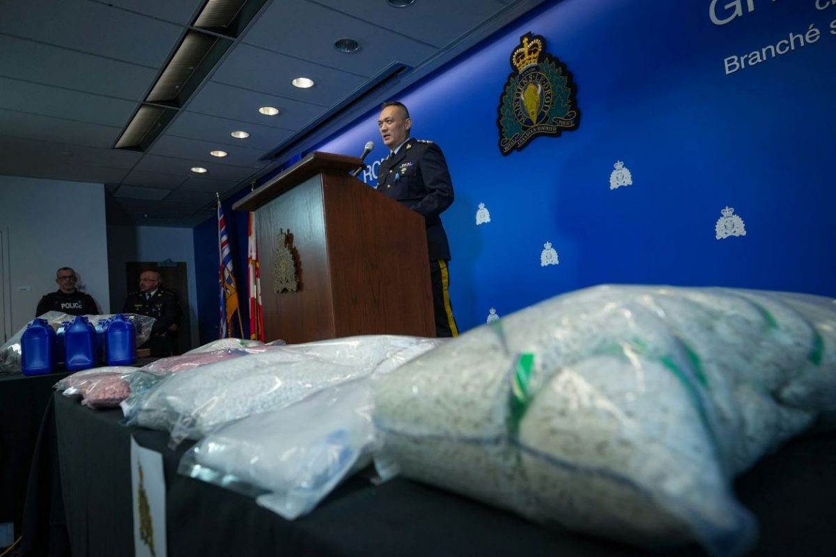 RCMP Chief Supt. Will Ng speaks at a news conference as seized fentanyl pills are displayed in Surrey, B.C., in March 2023. Years of civil forfeiture regulations do not appear to be resulting in any meaningful abatement in organized crime, particularly in the illicit drug trade. THE CANADIAN PRESS/Darryl Dyck