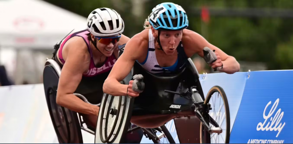 Susannah Scaroni, right, and Jenna Fesemyer at the women’s 5000-metre race at the U.S. Paralympic Track Team Trials at the Ansin Sports Complex in Miramar, Fla., July 18, 2024. (AP Photo/Caleb Craig)