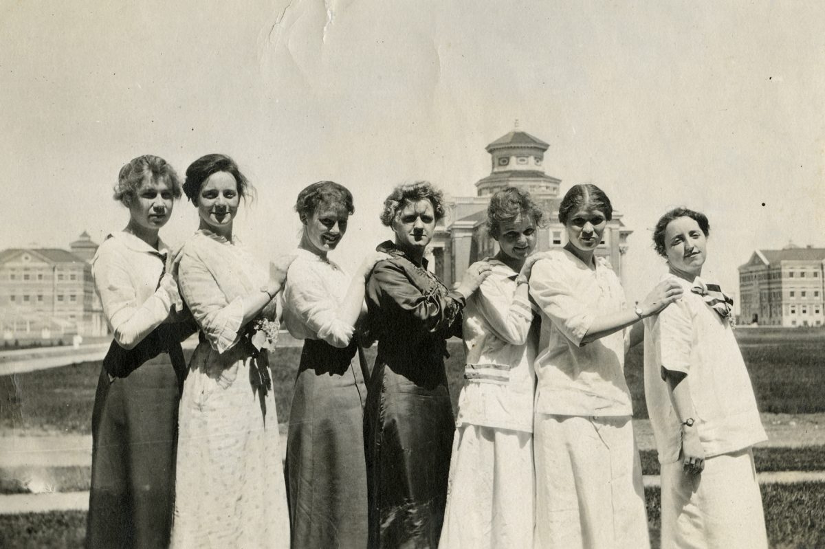 Manitoba Agricultural College students pause for a photo with UM administration building and classroom buildings in the background, circa 1900s. // UM Archives & Special Collections.