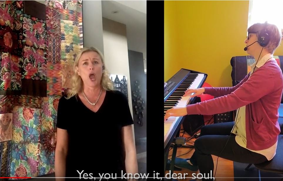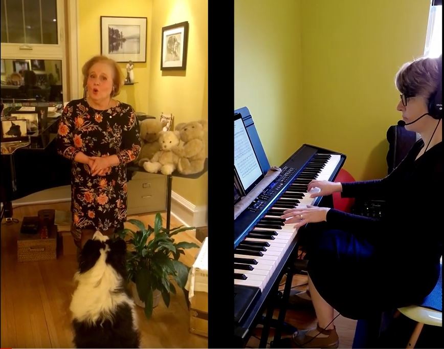 For Desautels faculty members Laura Loewen (collaborative piano), Monica Huisman (soprano), and Tracy Dahl (soprano), remote collaboration is complicated. Effective collaborative piano performers work with the visual and auditory cues they receive from their collaborators, so performing together from afar involves more than a click-track to ensure synchrony and tempo. After determining the pieces they would perform, Loewen, Dahl, and Huisman engaged in a series of back-and-forth recordings to ensure the integrity of the performances, with Loewen listening to and watching each performer’s final vocal performance multiple times before providing her final collaborative piano piece. The separate pieces were then sent to Toronto-based tenor Colin Ainsworth, who quickly and deftly edited them together into a final video performance. Huisman and Loewen performed Richard Strauss’ “Zueignung.” Dahl and Loewen performed “Old Mother Hubbard,” by Victor Hely Hutchinson, with a standout debut performance from Dahl’s other isolation collaborator, Dobbie (dog, vocal range undetermined). Huisman and Loewen’s collaboration can be seen HERE, while Dahl and Loewen’s collaboration can be seen HERE.