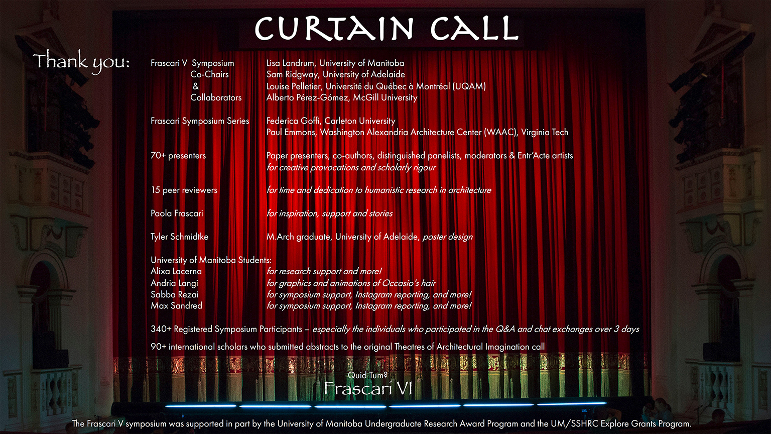 Co-chaired by Dr. Lisa Landrum from the Faculty of Architecture, University of Manitoba, with Dr. Sam Ridgway from University of Adelaide, the interdisciplinary symposium featured 28 paper presentations by established and emergent scholars from across North America, Europe and Australia; plus two special panels with award-winning theatre architects and directors; and 11 Entr’Actes (2-minute videos), animating intervals between sessions with multi-media interpretations of the symposium themes.