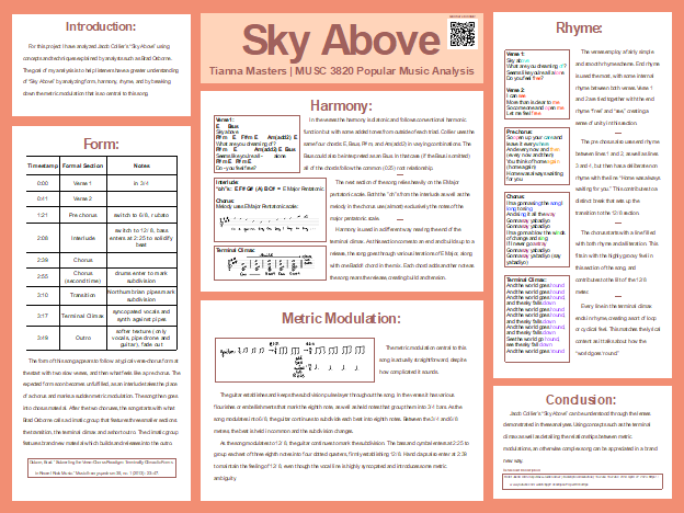 Tianna proved to be as adept academically as she was in performance, and threw herself into research. While in the Desautels Faculty of Music’s Popular Music Analysis course (MUSC 3820), Tianna engaged in detailed research on Jacob Collier’s complex “Sky Above,” analyzing the form, harmony, metric modulation, and rhyming scheme.