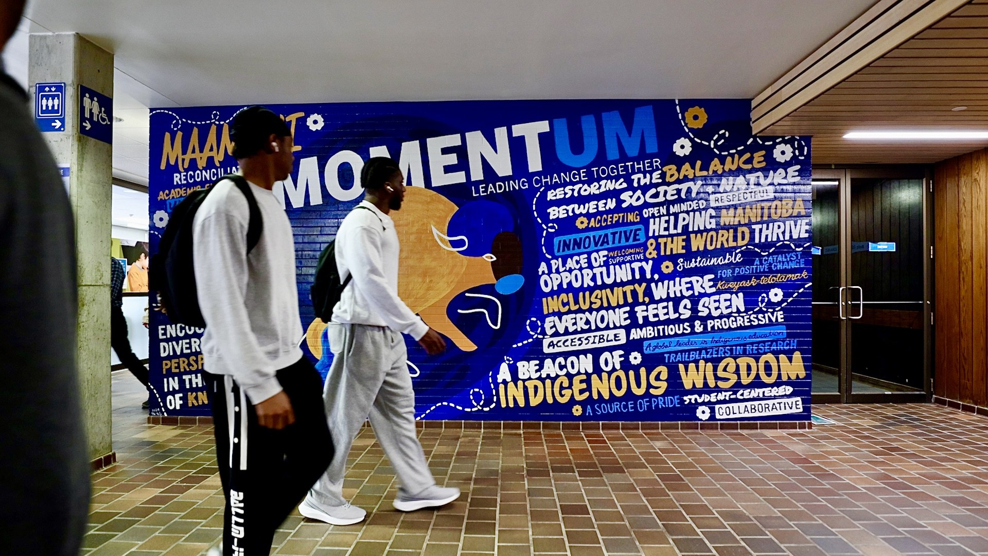 UM community members walk past the MOMENTUM mural on the Fort Garry campus.