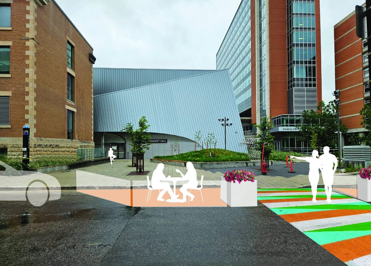 A rendering of Maclean Crescent, in front of the new Desautels Concert Hall, illustrating how some of the temporary measures will be used to test traffic flow changes.