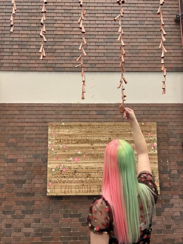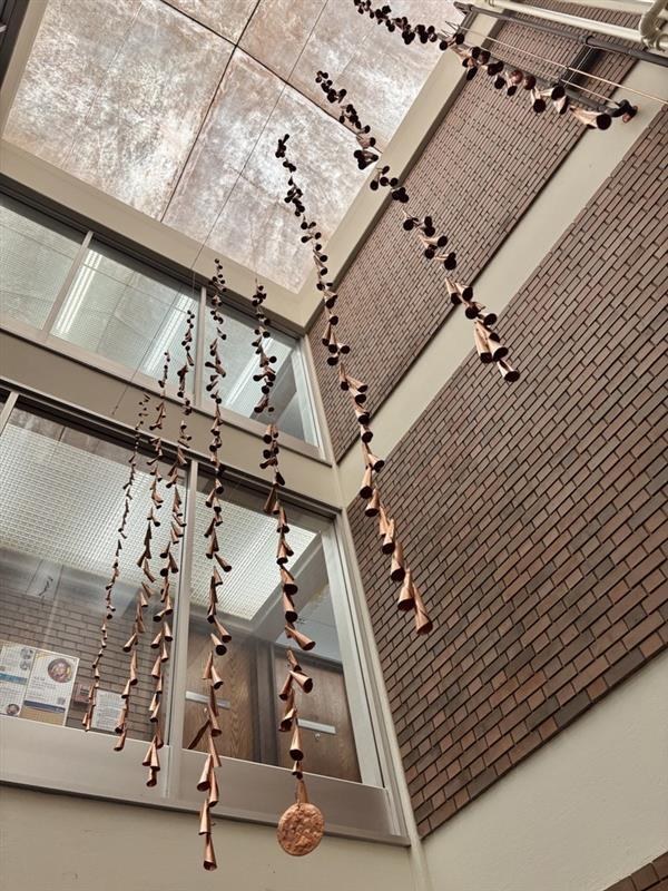 A creative works grant, hundreds of copper circles transforming into jingles and two women carefully listening—these elements have transformed the fourth-floor atrium of Fletcher Argue.